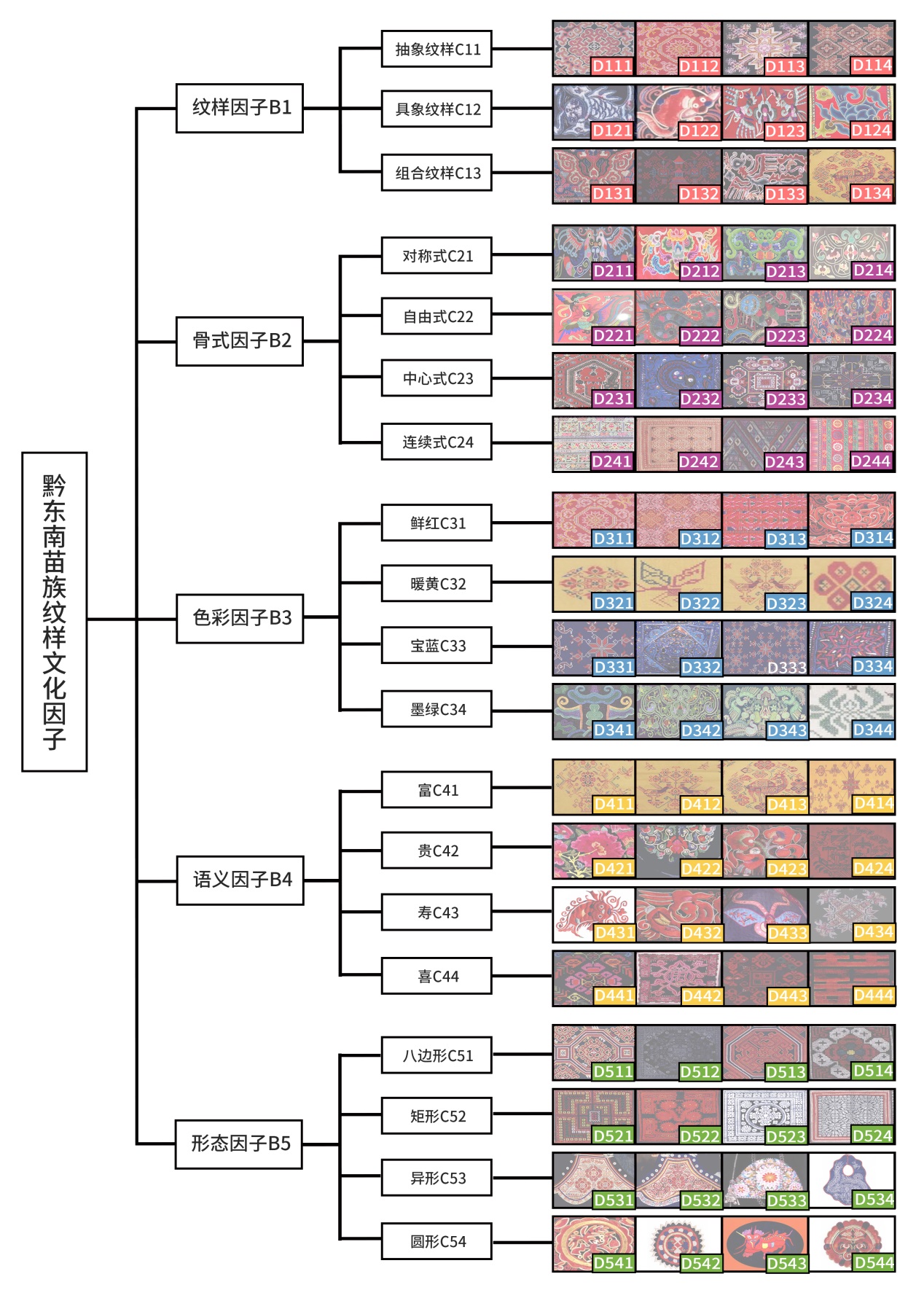 为进一步促进黔东南苗族服饰纹样的传承和可持续发展,本研究以文化因子为依托,对其纹样进行推演设计,在保留纹样典型特征的基础上赋予其新的艺术价值。通过分析苗族纹样的文化因子从纹样、骨式、色彩、寓意、形态等多维度探究其特征,运用层次分析法筛选出符合时代审美的设计要素,通过形状文法对其进行创造性转译,得到兼具时代美感和民族特征的设计纹样。将最终的设计纹样运用于文创设计中,以文创产品为载体,进而彰显黔东南苗族纹样的文化内涵和艺术价值。以苗族纹样文化因子为基础的设计实践表明,运用层次分析法和形状文法能有效地提炼苗族纹样的设计特征,并引导纹样进行良性演化,为我国苗族文化的设计创新和传承发展提供了可行的方法。