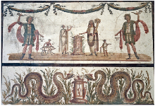 新疆吐鲁番阿斯塔那、青海都兰等地出土了一批北朝至唐时期的对饮纹锦,其纹样的起源与背后的含义,学界迄今尚未得出确切结论。本文以考古遗物和相关图像为基础,以文化意涵和宗教信仰为探索方向,进一步探究对饮纹锦纹样的母题来源和其中暗含的东西方文化交流过程。笔者梳理后发现,对饮纹锦上方联珠圈内手持饮酒器的人物形象来源于罗马帝国的神祇拉尔。它作为家庭神的同时还是道路、守护之神,该主题因受粟特人喜爱,进而为中国织工所吸收,所制的对饮纹锦成了一类针对粟特人需求的特殊商品。此类织物纹样的出现,反映出北魏至唐代中国对外来文化的消化、吸收与反馈,也体现了粟特商人在丝路贸易、宗教传播和跨文化交流中的承接作用。